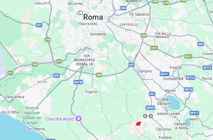 Die Gegend um Rom ist wunderschön und hat nicht nur geschichtlich einiges zu bieten. Die rote Markierung zeigt die Lage der Mittelwellenstation Santa Palomba der RAI.; ca.20km südlich der Metropole.